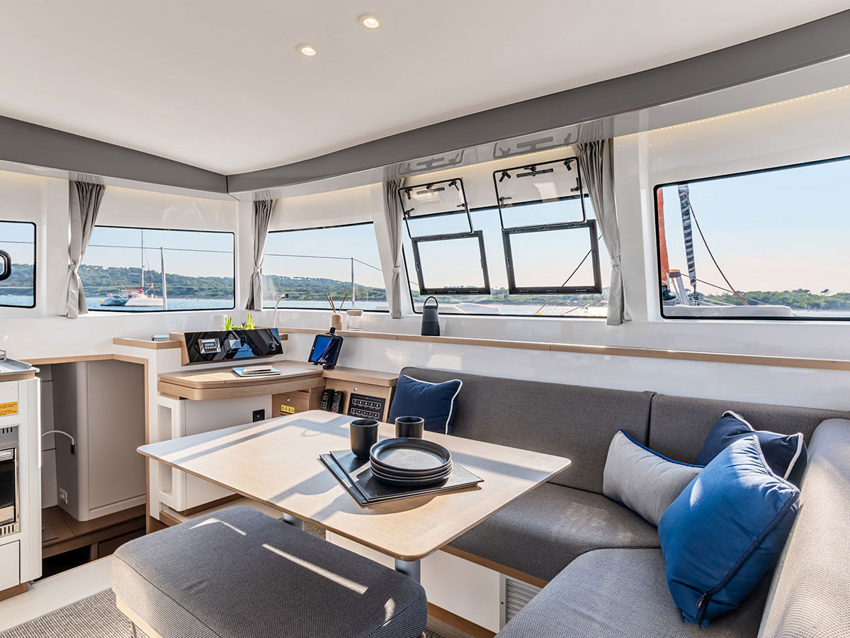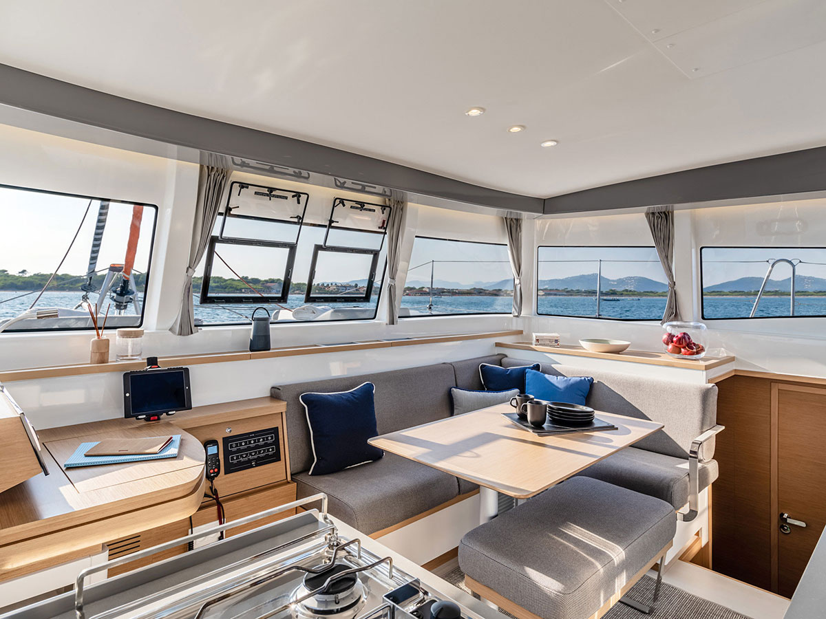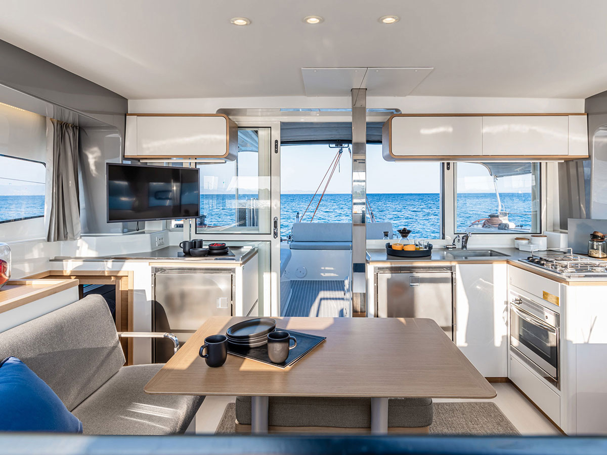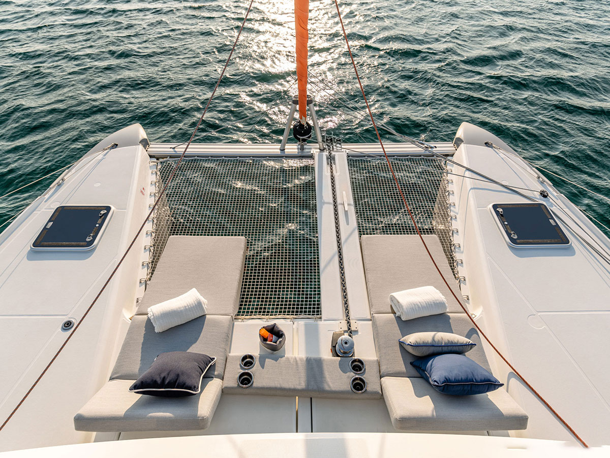 The cockpit of this boat is bathed in light thanks to its opening roof. On the outside there is the usual trampoline between the hulls, great for sunbathing, as well as the large exterior table. The hulls have a large volume with the option of a three double cabin or four double cabin version.