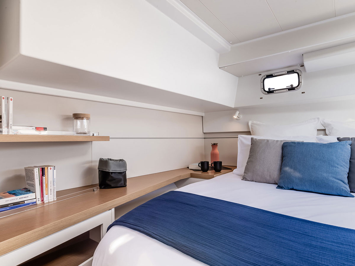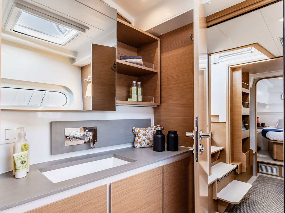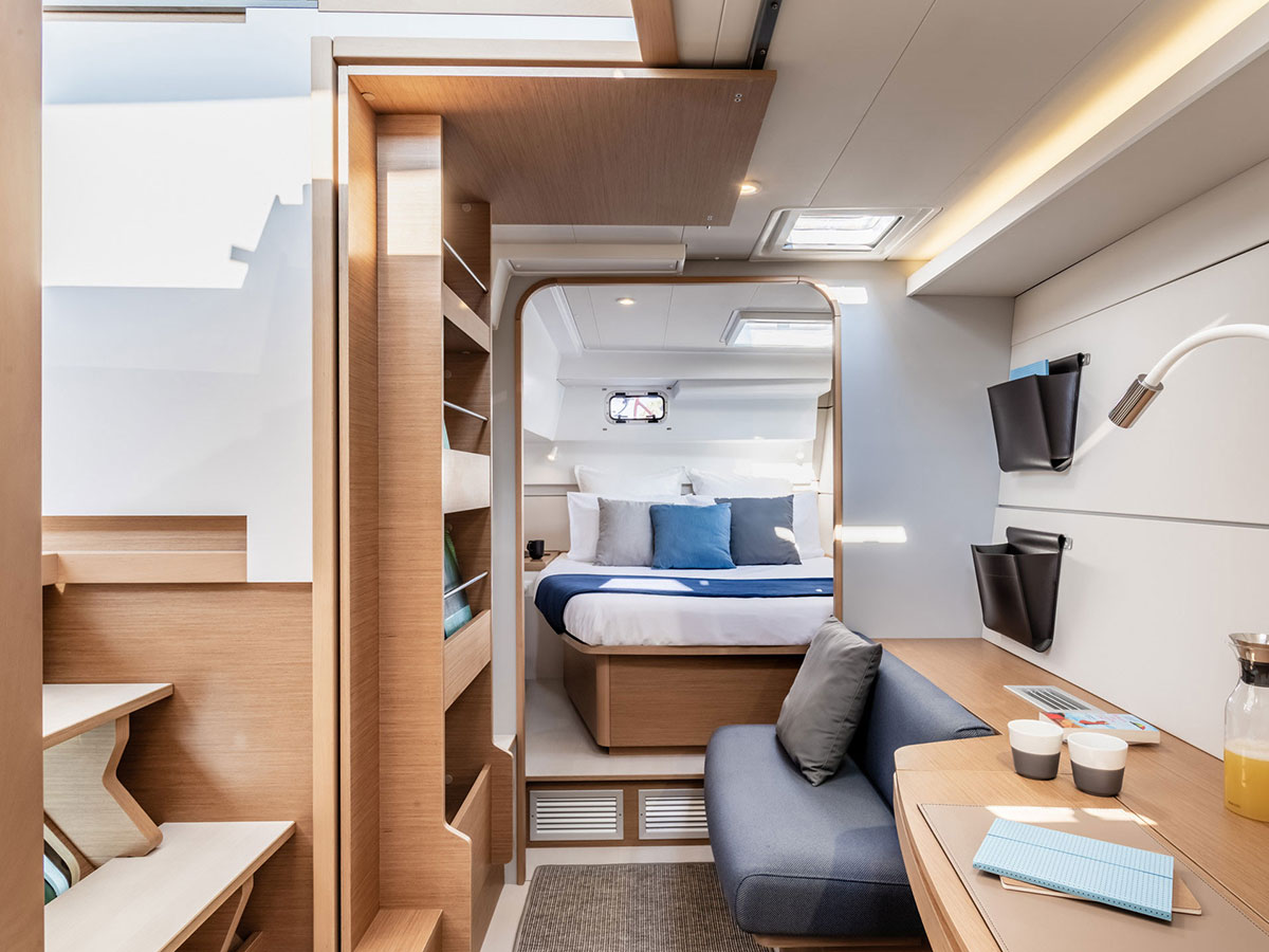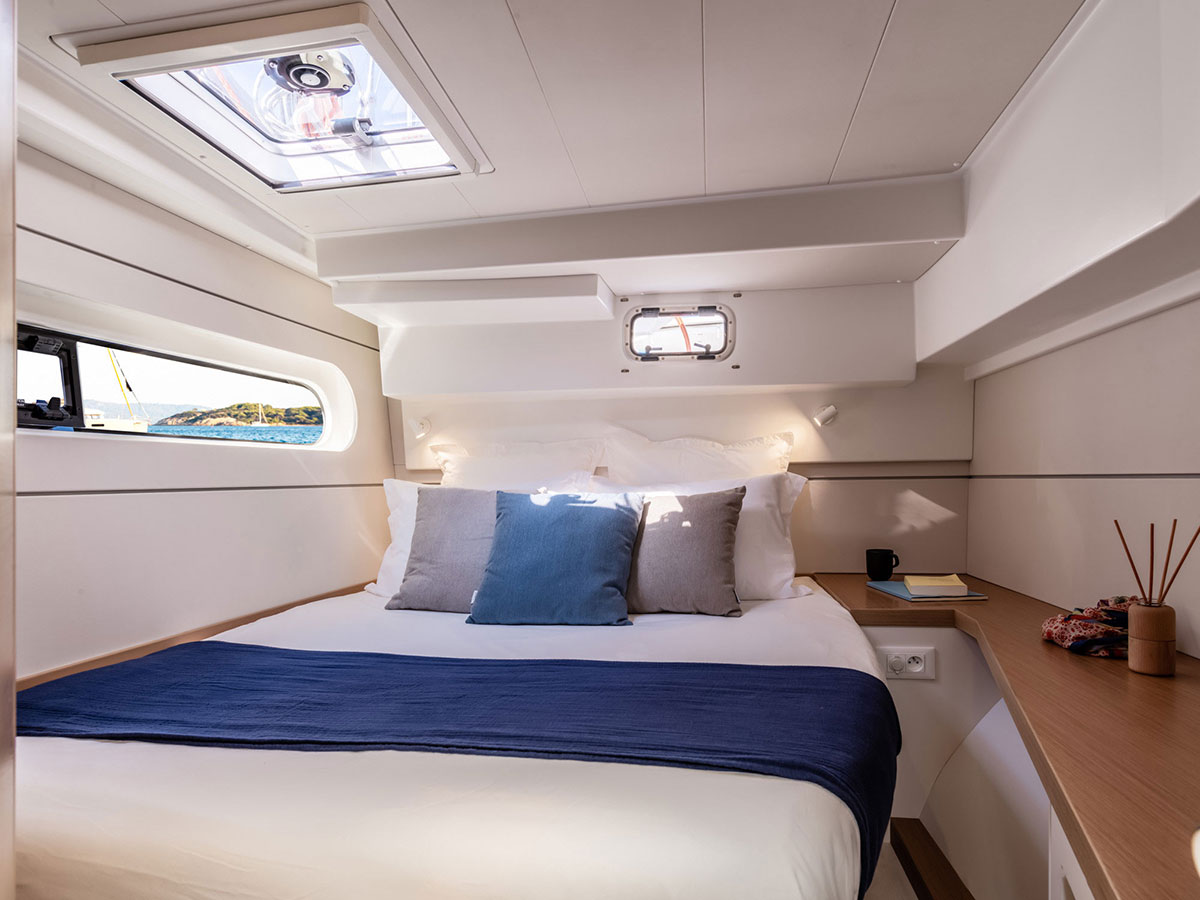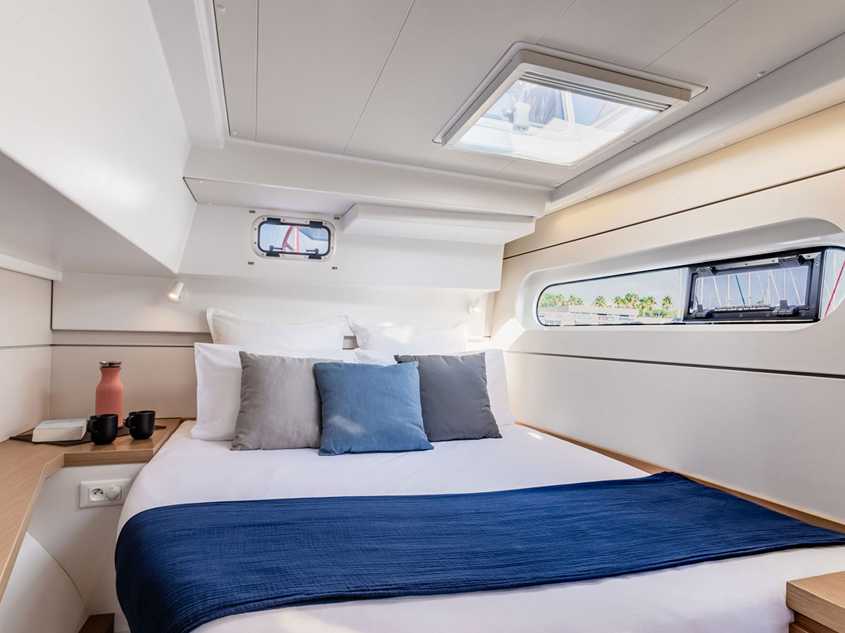 The cockpit of this boat is bathed in light thanks to its opening roof. On the outside there is the usual trampoline between the hulls, great for sunbathing, as well as the large exterior table. The hulls have a large volume with the option of a three double cabin or four double cabin version.